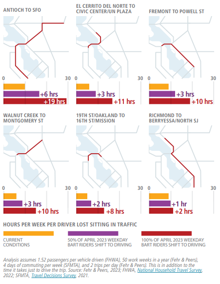 What if BART just reduced operations to save money? The result would be catastrophic, even for people who don’t use BART, argue the authors. It would have ripple effects on the economy, depriving people of access to jobs. Traffic has returned to pre-pandemic levels. Therefore, for people who drive, losing BART would mean even longer, more grueling commutes, as shown in the chart below: