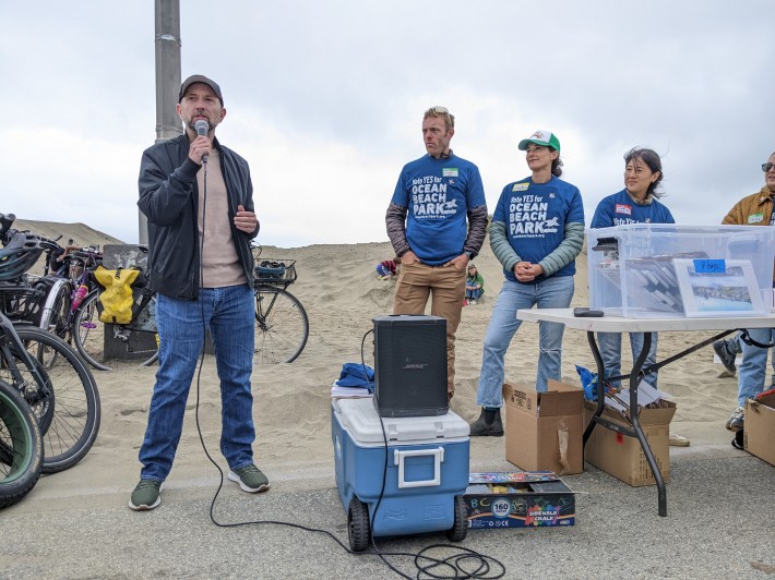 Many of the participants had met up at Duboce Park an hour earlier for a group ride to the Great Highway for the event. Molly Hayden, a self-described serial advocate from the Lower Haight, kept the ride festive with a large speaker for music and a machine that sprayed bubbles from her cargo bike. But why does she support the Ocean Beach Park campaign? For one, she read the studies that show the section of the Great Highway from Lincoln Way to Sloat is redundant, given the proximity to the Sunset Boulevard freeway, which it parallels. “I put my faith in SFMTA’s studies that Sunset and 19th can handle the traffic,” she told Streetsblog.