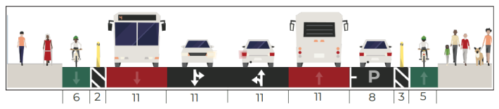 This design will enable the installation of the greatest number of pedestrian safety improvements, more comfortable facilities for bicyclists, more features for people with disabilities, more commercial loading and parking, and more amenities for transit riders, all while having minimal impacts to current transit operations (3 second delay southbound, 9 seconds faster northbound). Among other elements, the project design will feature a slower, calmer roadway for all users, fully separated bike lanes, pedestrian safety islands, and transit improvements, including approximately 10 bus boarding islands with shelters and seating.