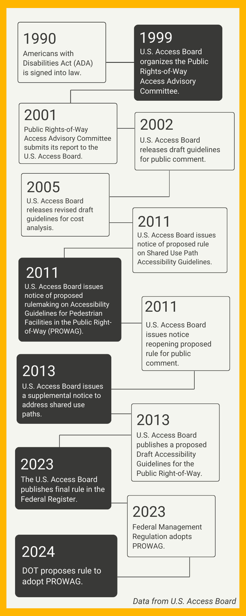 To understand how long this rule has been in the making, let’s first review the history of the ADA and PROWAG with a nice, handy graphic: