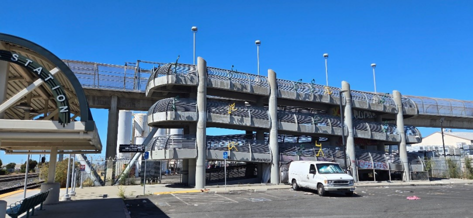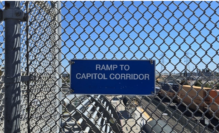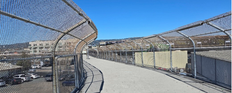 The bridge is approximately 800 feet long, and aside from its concrete, it features chain-linked fencing. Beneath the bridge are train tracks and industrial land, used for what appears to be a roofing supply store and a towing company. While the Bay Area has several famed bridges, the Coliseum BART Pedestrian Bridge is not one of them. And yet, it gets the job done. On the far east end of the bridge is the BART station. A little farther west are stairs that connect to the bus stops on San Leandro Street. Farther west is a ramp that connects to the Capitol Corridor platform, an Amtrak station that was built in 2005.