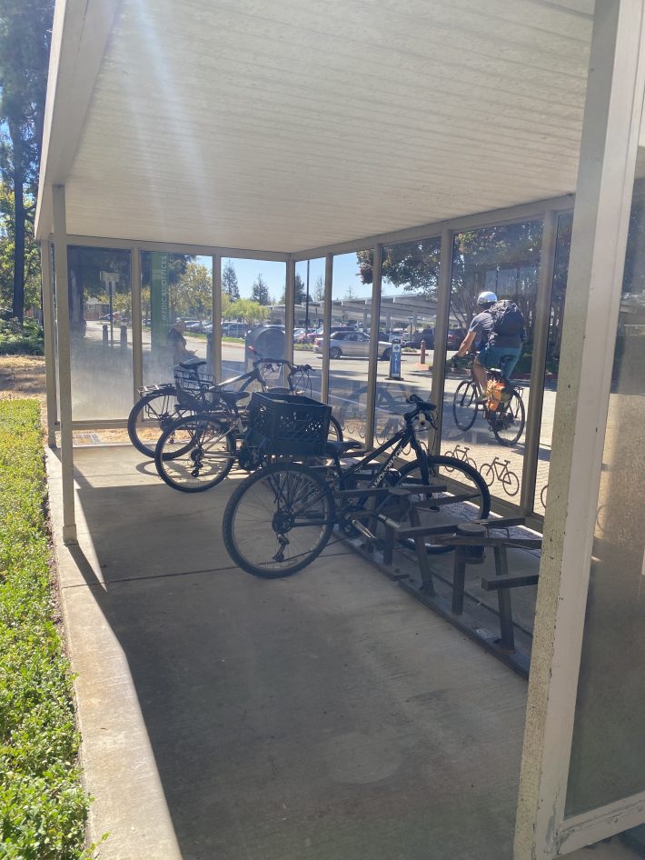 The three mile trip took less than an hour, and I arrived at Kaiser with plenty of time to spare. I walked across the parking lot (no sidewalks) and noticed that they have “Free Valet Parking” so I decided to see what kind of parking they offer for bicycles. The man at the information desk pointed me to the main hospital building, and I found a protected bike parking area which, though small, was stylish and useful. I asked a bike rider how he liked it, and he said he’s been a bike commuter since he began working at Kaiser 10 years ago, and has never had a helmet or gloves, much less a bike, stolen. They also have bike lockers in the employee parking lot.