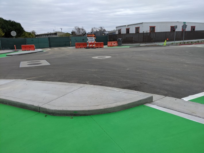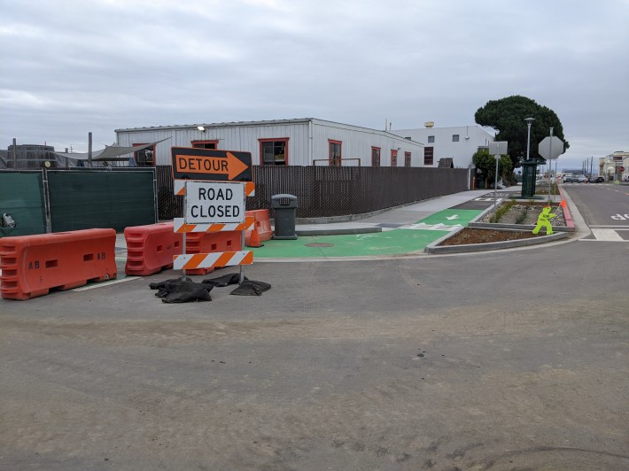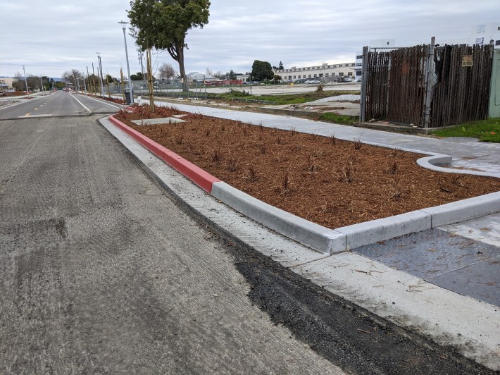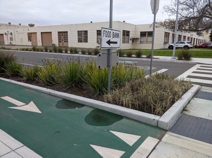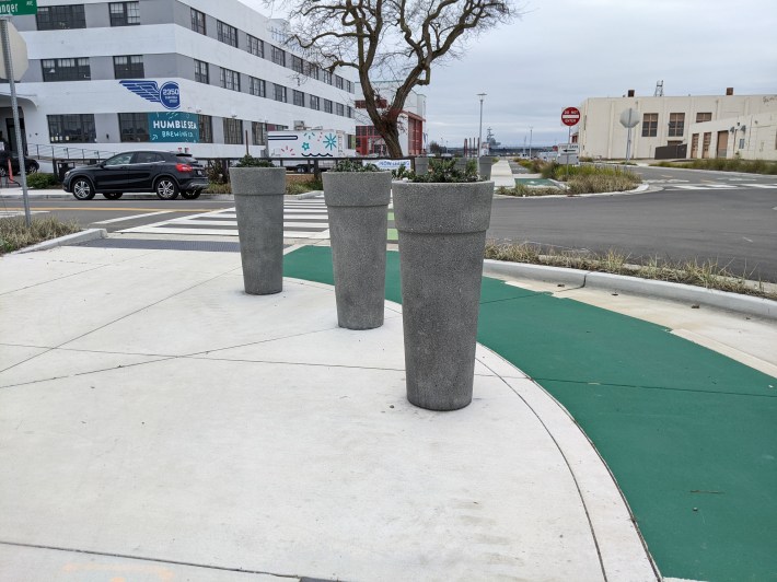The project planners also paid good attention to important details, with gently beveled curbs between the bike lane and the sidewalk, clearly defining where bikes and pedestrians are supposed to be without presenting a hazard. Alameda is also taking the idea of concrete protection seriously, as with these planters on the corners: