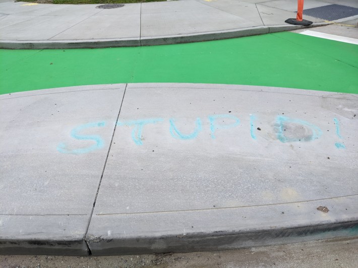 One amusing little item noticed by Streetsblog: clearly at least one driver doesn’t like being forced to take turns slowly and carefully—and they stopped to make their feelings known: