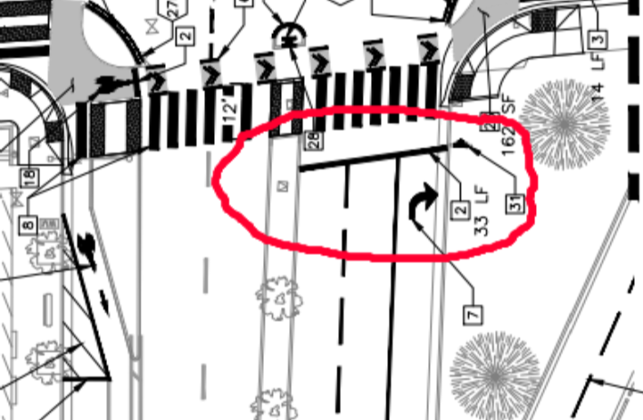 It’s clear from the exchange with the BPAC, that because the city is getting rid of the slip lane, the city’s traffic engineers think it needs to create a right-turn lane for cars. To do that, they have to convert the existing bike lane that permits cyclists to go north. Otherwise, it’ll cause “level of service” delays at the intersection.