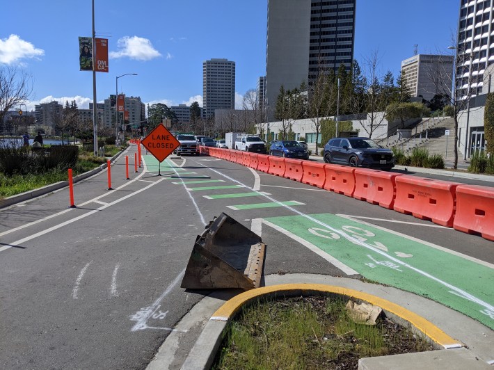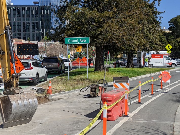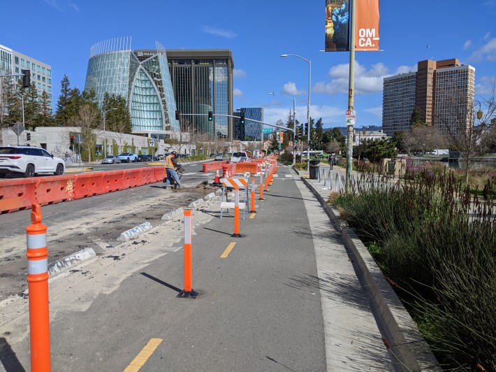 The short but awesome section of protected bike lane on Lakeside and Harrison on the west side of Lake Merritt is currently getting a long-anticipated upgrade plus a short extension. “The Lakeside Family Streets project” will extend “the existing cycletrack north to Grand and around the corner to Bay Place, as well as adding a protected intersection at Harrison/Grand and concrete protected bikeways on Harrison from Grand to 27th Street,” explained Bike East Bay’s Robert Prinz.