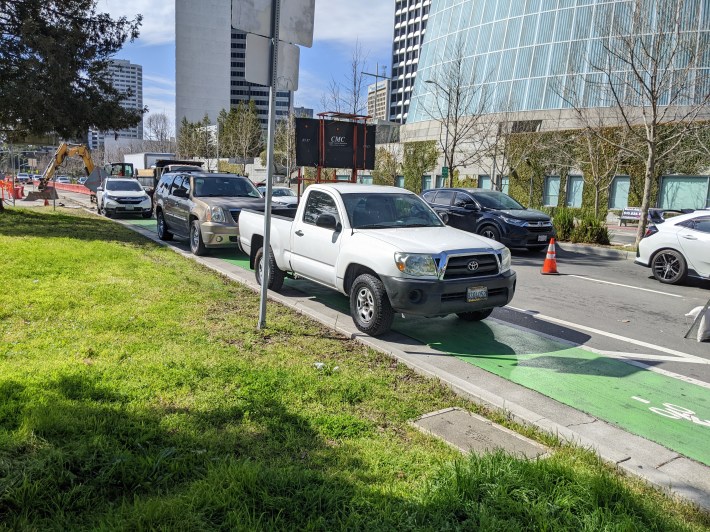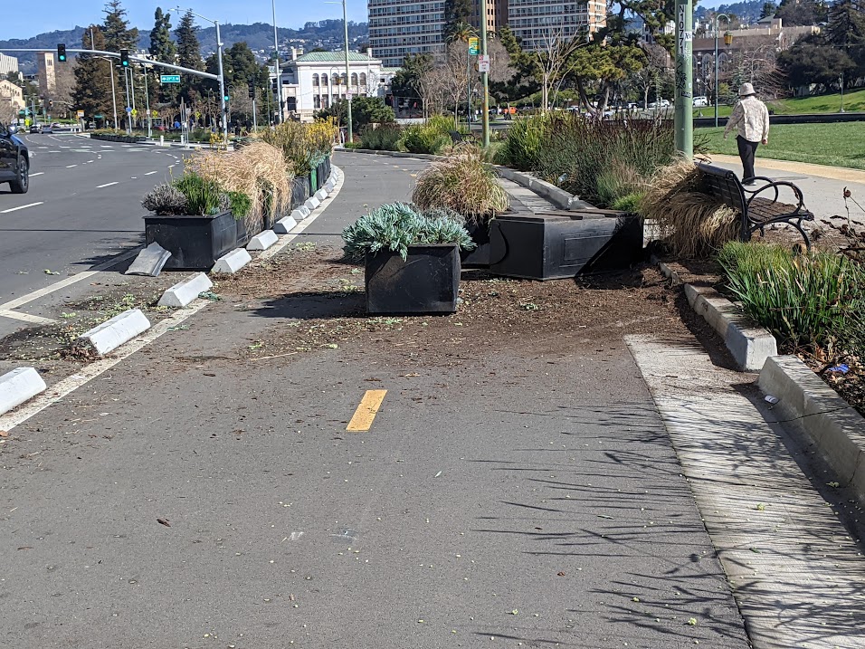 To be clear, there are many things to like about this project; it’s an improvement over existing conditions. It’s great that the slip lane is closed. And it’s good news that the planters and temporary curb stops, for reasons that are obvious from the photo below of the aftermath of an errant driver, will be replaced with more robust concrete protection.