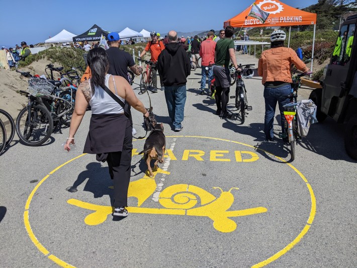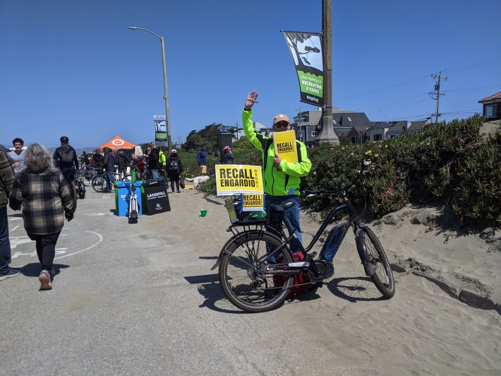 Streetsblog found only one person gathering signatures for the Engardio recall campaign, launched by people unhappy with the results of Prop. K and his support of the park. In addition, there were perhaps 10~20 protesters driving around on Lower Great Highway, intentionally creating a traffic jam with their cars, honking their horns, and attempting to disrupt the festivities.