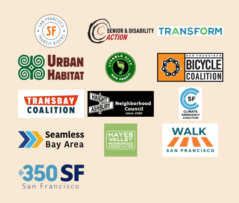 - The SFMTA Board – Given the severity of the budget deficit, the SFMTA has already begun its 2026-2028 budget process 6 months early. We need to urge them not to compromise on transit, non-car transportation modes, or street safety, and to create an aspirational vision that will give voters a clear reason to support public transit at the ballot.