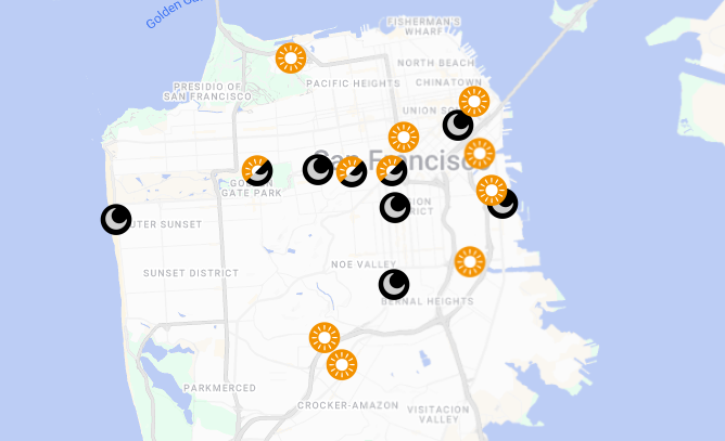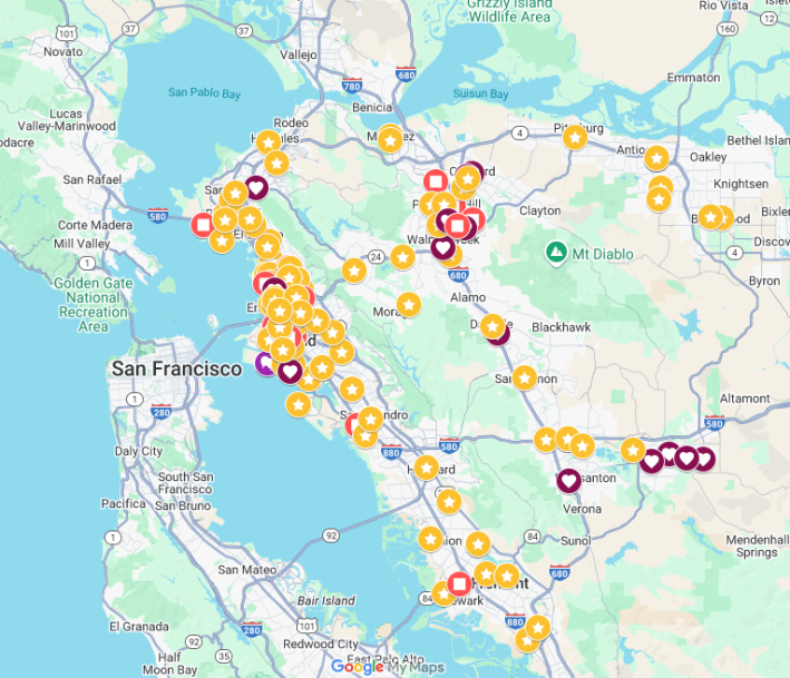 SFBC energizer station map - Bike East Bay also has a full day of events planned, starting with early morning rides with elected officials in both Oakland and Berkeley. There will be energizer stations throughout Alameda and Contra Costa Counties. And there’s going to be an after-party from 4-7 p.m. in Oakland at Drake’s Beer (co-sponsored by Walk Oakland Bike Oakland).