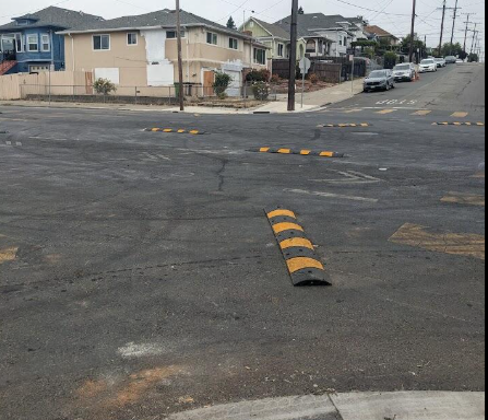 If the removal story seems familiar, recall that last year Oakland DOT removed installations because a reckless driver flipped their car on a much larger guerrilla safety project. At the time, Oakland DOT suggested those installations—which included truck tires and planters—were exceptionally dangerous (presumably to reckless drivers) and required removal. But the plastic speed humps, as pictured below, are already fairly ubiquitous in cities throughout the Bay Area, including Oakland. There’s simply no credible justification for their complete removal.