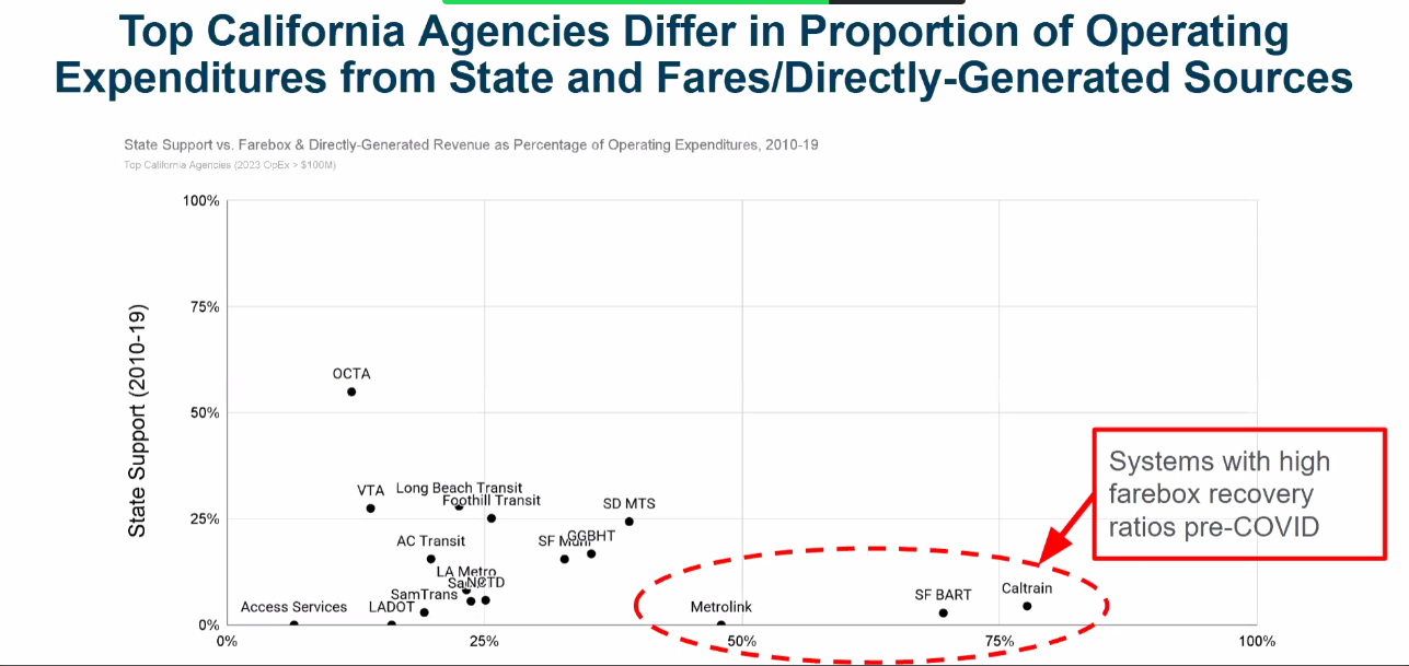 As seen in the above chart from the presentation, Metrolink in L.A., BART, and especially Caltrain depended on relatively wealthy 9-to-5 commuters to fund operations from 2010 to 2019. Then the COVID pandemic and “work from home” changed everything.
