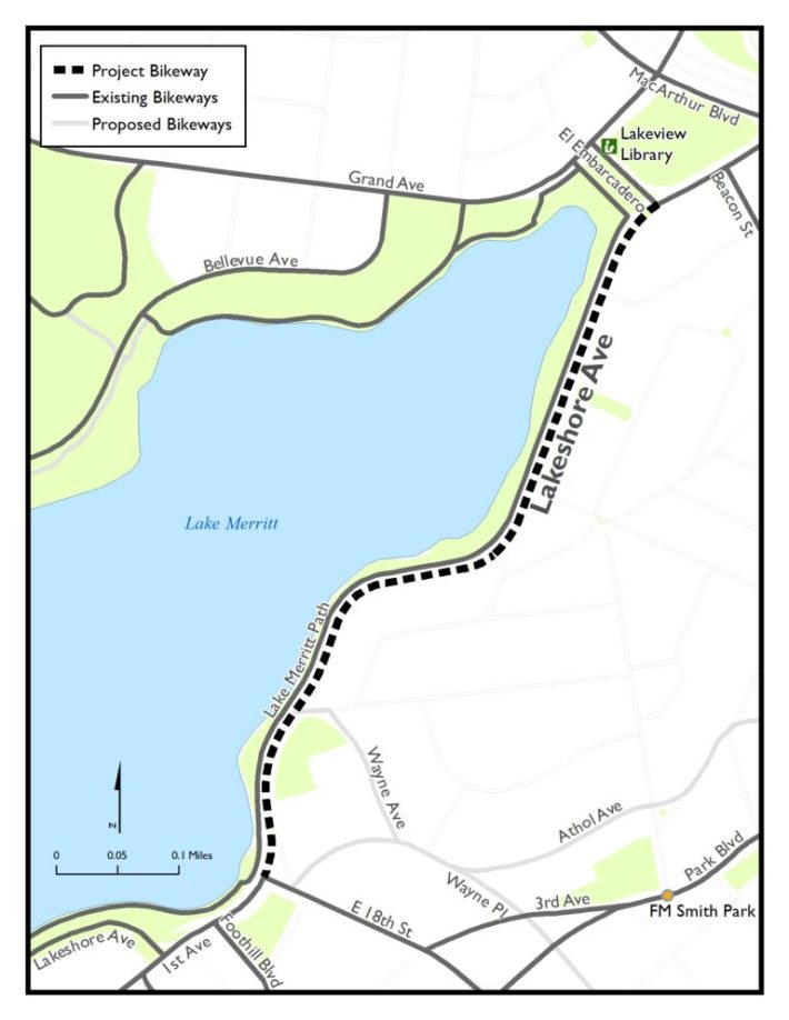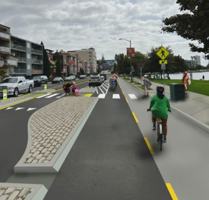 This 2-way concrete-protected cycletrack was expedited 2 years ahead of the original 2027 construction schedule in response to a tragic crash that occurred in the summer of 2023. We are pleased to have worked with city staff and local advocacy partners to move this project forward, as part of our greater Lake Merritt Loop campaign for protected bikeway facilities all the way around the lake.