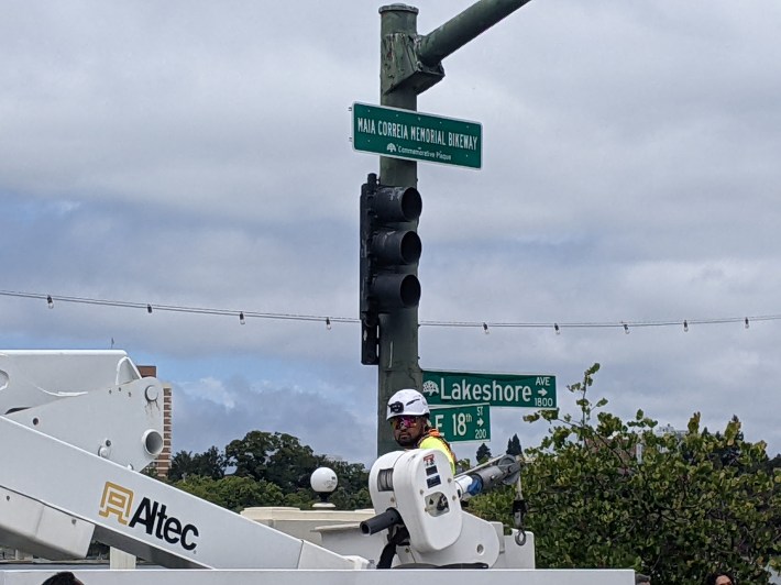 At the end of the event, a new sign was unveiled over Lakeshore, naming the soon-to-be-protected bike lane after Maia Correia.