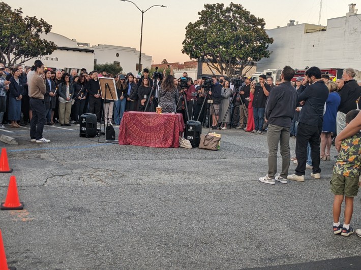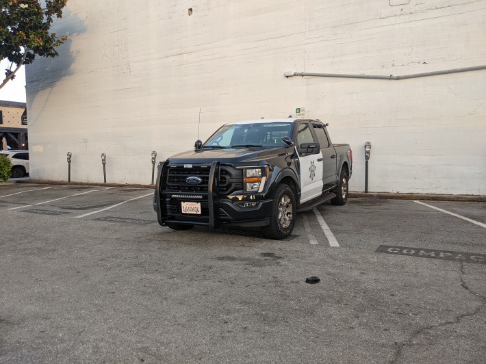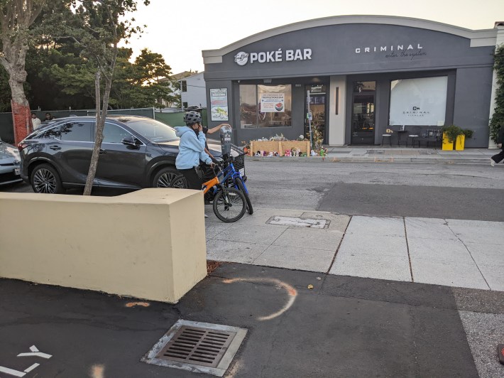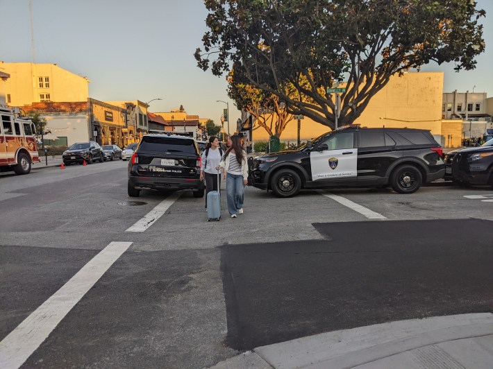 Meanwhile, Burlingame police officers were among those who attended Sunday night's vigil. Below is a picture of some of the officers' parked cars blocking the crosswalk and daylighting zones, next to the mostly empty parking lot where the vigil was held (note this location was less than 200 feet from where the boy was killed):