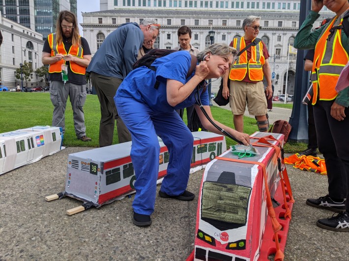 Chanting “fund transit now,” the demonstrators held cardboard trains on stretchers and demanded that Governor Newsom make good on his promise to fund transit. This loan, explained Wiener, is essential to keeping trains and buses running until a regional measure, Senate Bill 63, goes in front of voters in November of 2026.