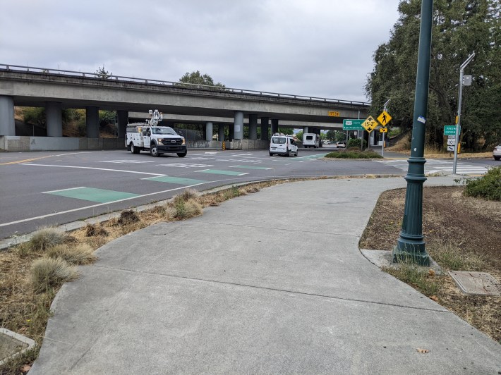 “Much to everyone’s surprise, there are as many cyclists using the path as riders on the SMART train,” she said. Of course, some of that is overlap (cyclists who are on their way to ride the SMART train), but it underscores the importance of gathering data to convince sometimes skeptical bureaucrats that people will bike (and take the train) when safe, comfortable paths exist. Unfortunately, the path ends at the SMART storage yard, meaning there’s still work to do going south. The same goes for the bike path/road intersections, which are confusing and, sorry to say it, couldn’t have been designed by anyone who actually rides a bike.