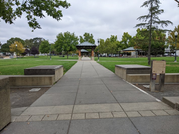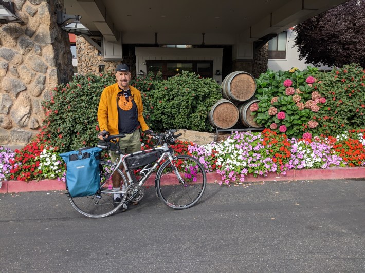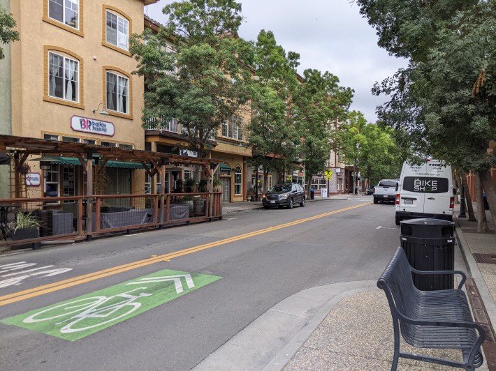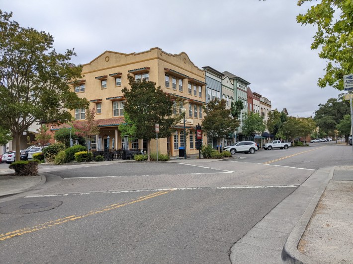 That actually speaks to where Sonoma County needs to do more work on bike facilities—the lack of east-west connections to the SMART station and paths is a big problem. As soon as I tried to bike perpendicularly to the tracks, away from the Windsor town center, things got squirrelly. For example, my hotel, while friendly, comfortable, and nice, was on the far side of 101, along with a car-centric shopping center and office park. So while it’s seven quick minutes by bike from the hotel to Windsor station, the last part of the ride is sketchy where one has to bike through Caltrans-controlled territory. I biked on the empty sidewalk through there because I don’t have a death wish.