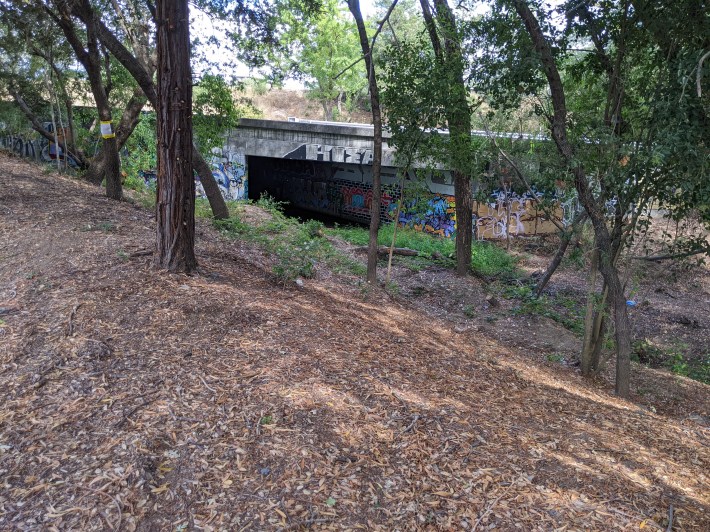 Ultimately, there should be a separated bike and pedestrian link that doesn’t cross the ramps at all. There’s a nearby creek/flood channel that goes under the freeway and ramp complex (see pic below), so I’m sure some clever engineer could design a path alongside it to keep cyclists and pedestrians truly safe from all the 101 traffic.