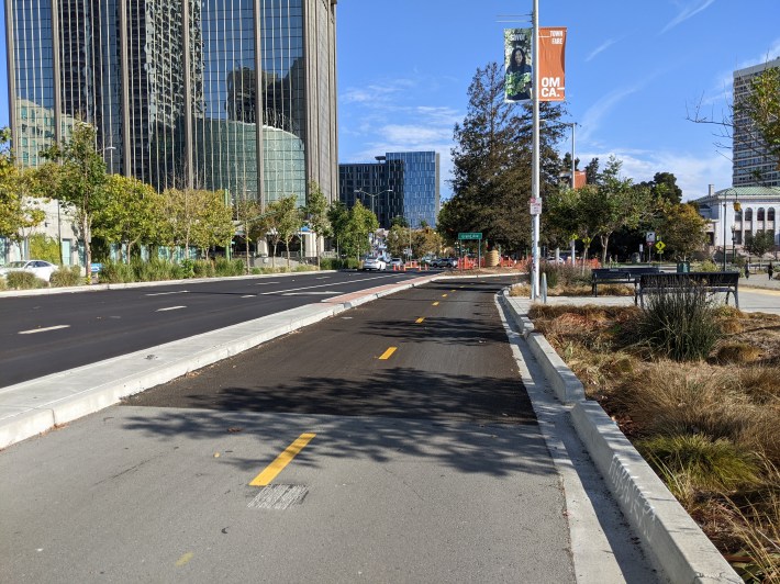 Oakland cyclists are watching with delight as the city makes steady progress with its Lakeside Family Streets project, which is adding concrete-protected bike lanes on Harrison and Grand, plus safer pedestrian crossings. Another short but sweet feature of the project just opened: a cut-through ramp for cyclists going north-south on Harrison (see lead image).