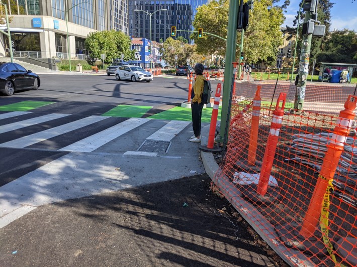 Streetsblog last covered the progress on this major intersection in July, when the construction on the cut-through started. Before that, Streetsblog revealed that Oakland DOT hadn’t planned on providing a route for cyclists to go directly north/south on Harrison across Grand.