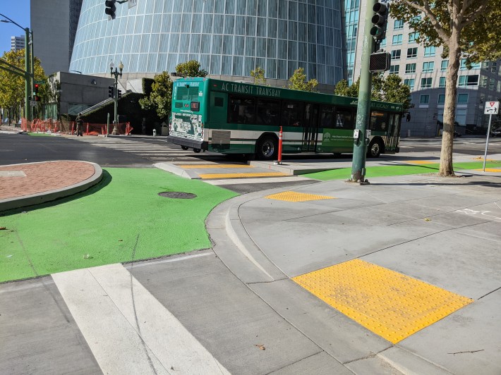 Oakland made this an issue only because they insisted on having six lanes for cars on Harrison (two for drivers going north, two for drivers going south, a parking lane, and a new right turn pocket for northbound drivers on Harrison to turn east onto Grand). Why the new turning lane? When they closed the dangerous slip lane that used to exist here, they converted the existing northbound bike lane into a turning lane for cars. So yes, even on a bike safety project, avoiding even a minute of driver delays was still the highest priority.