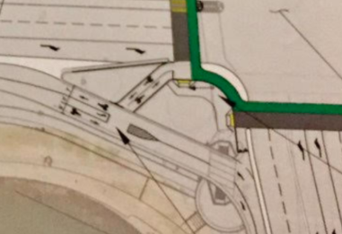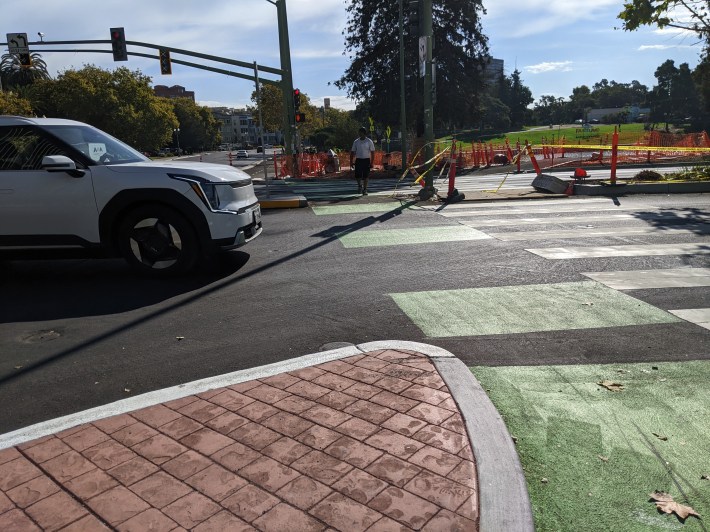 “The short ramp from the former slip turn lane to the cut-through path is a not-insignificant 16 percent grade, because the path was designed to sit on top of the median island instead of cutting through it, to protect the tree roots,” said Prinz. But, as Streetsblog confirmed firsthand, it is totally rideable and a great improvement over the deadly zipper-across-the-slip-lane that existed before.