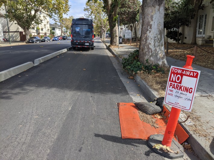 I encountered some blocks where there were entire lines of illegally parked cars, none with tickets on them. Other blocks were completely clear. I reached out to the City of Alameda to find out if it plans to do any parking enforcement. Advocates commented that the blocks have too many gaps that allow drivers to pull into the lane. "Although it wasn't in the plans, we're really hoping that additional flexposts can be installed where needed to discourage drivers from entering or parking in the cycle track, as was done along Clement," wrote Bike Walk Alameda's Cyndy Johnsen.