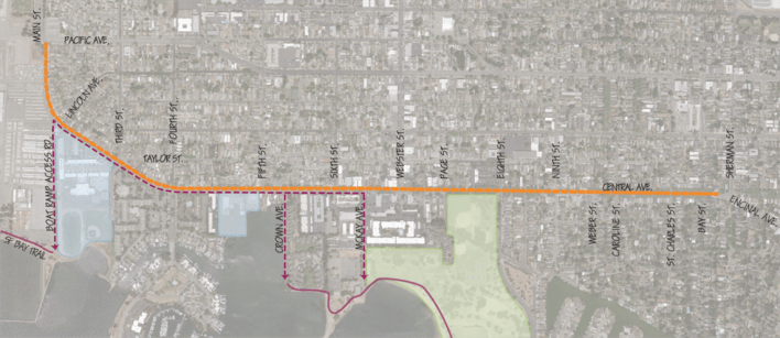 This does allow, however, more-or-less continuous protected riding from the schools on the corridor to the Point development as well as east to Webster and to the Shoreline protected bike lane, one of the first built in the Bay Area, via side streets and Washington Park (see map below).