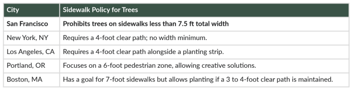 But San Francisco, apparently, doesn’t want to plant trees that close to the street. “This is a car-centric rule being used to de-green historic, narrow streets and replace vibrant sidewalks with concrete.”