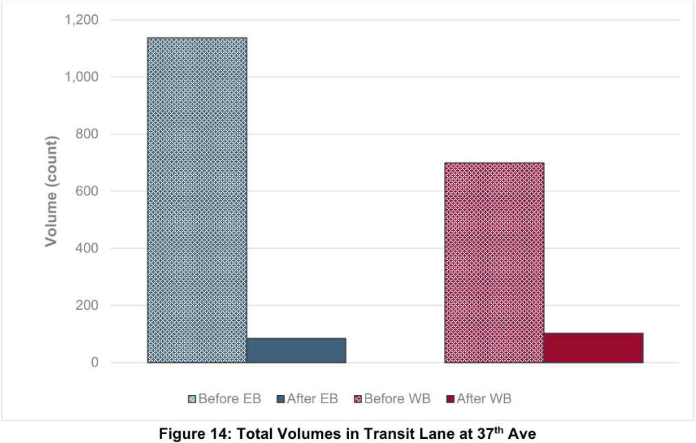 - Drivers used the bus-only lanes for illegal left turns and u-turns, commonly over pedestrian crosswalks after hardened medians.