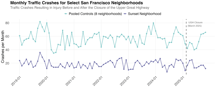 Did the Upper Great Highway closure make Sunset neighborhood streets less safe? Supervisor Alan Wong claimed it did at a January 8 press conference, citing a simple year-over-year map comparison of crash data. But my analysis, using the same DataSF crash data with rigorous statistical controls, finds no evidence to support that claim, and if anything, the data suggest the opposite.