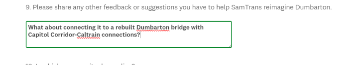 The project is exploring the feasibility of introducing fast, reliable zero-emission bus service, making it safer and easier to travel by transit, bike or on foot between communities in southeastern San Mateo County. And to avoid any confusion: this survey is about the Dumbarton rail corridor — not the Highway 84 Dumbarton Bridge.