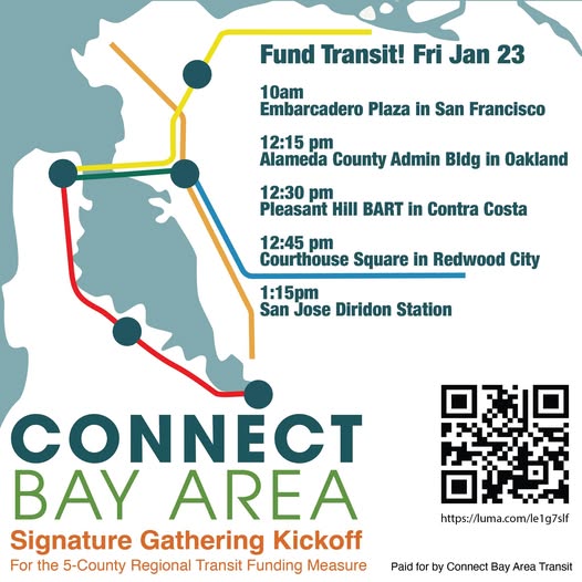 On Friday, January 23rd Connect Bay Area campaign leaders, labor and business supporters, transit riders, community advocates, elected officials, and volunteers will participate in a Five-county Day of Action launching the official signature-gathering campaign for Connect Bay Area, a regional transportation funding measure headed for the November 2026 ballot.