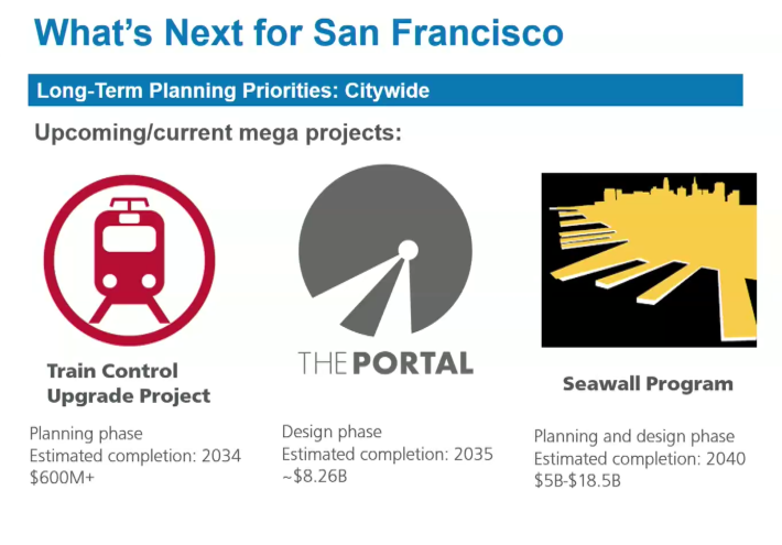 Kennedy pointed out that staff is working on three major projects already: train-control upgrades for Muni, "the Portal" tunnel to bring Caltrain and high-speed rail to the Salesforce Transit Center, and the Seawall Program.