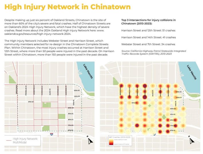 Half of Chinatown's streets are on the High Injury Network, including Webster Street. It is just a matter of time before another person is killed here unless we fix the design of the street. The Chinatown Complete Streets Plan includes calming traffic, widening sidewalks, reducing crosswalk lengths, reducing the number of travel lanes, and upgrading bicycle lanes north of 11th St.
