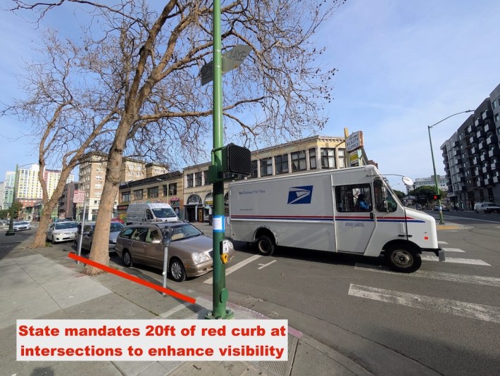 Protected intersections like on 14th Street, diagonal parking like on 13th, and corner bulb-outs like on 12th would very likely have saved a life by slowing the turning driver to a safe speed. The State of California mandates that cities provide 20 feet of daylighting at intersections to enhance visibility, but 12th and Webster is missing the required daylighting, which creates a hazard for people crossing. The 12th and Webster intersection has cars parked in the daylighting zone, which blocks visibility.