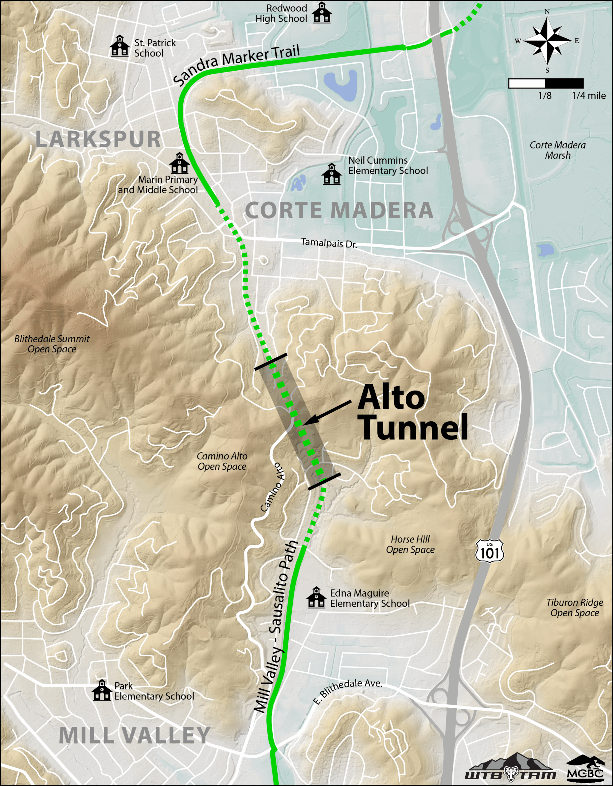 The tunnel, when opened, would connect directly to miles of already existing, highly utilized multiuse pathways in Mill Valley, Corte Madera, and Larkspur, extending nearly seamlessly into the Ross Valley and San Rafael. Although the project itself would be run by the County of Marin, local support is critical.