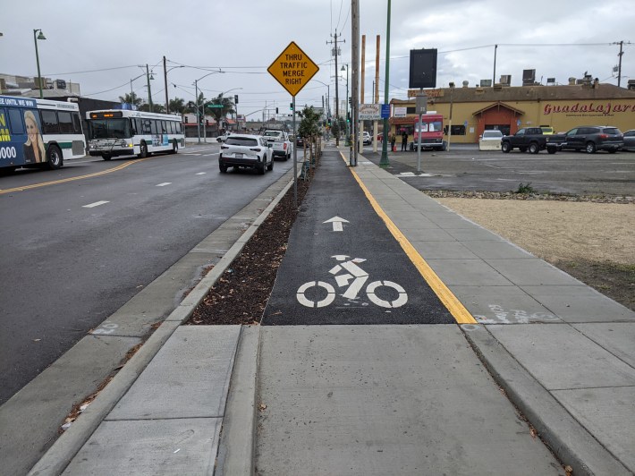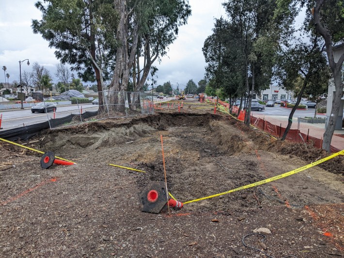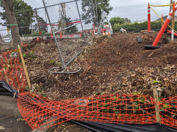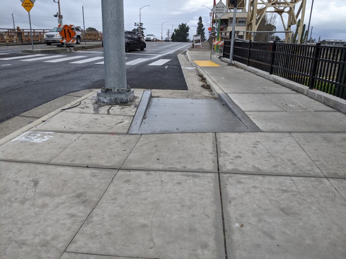 "The construction you are seeing is in preparation for bike/ped safety, a roundabout, and a new dog park," wrote Alameda's Sarah Henry, in an email to Streetsblog. "The project does not change the bike/ped path on the bridge itself, but the lead up to the bridge will include significant safety improvements."