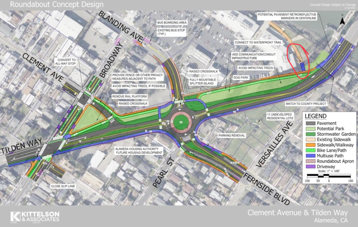 Work is underway in Eastern Alameda to construct a roundabout at Tilden Way/Blanding Avenue/Fernside Boulevard. Part of the project will also provide a safe, off-street connection between the four-mile cross-Alameda trail and the Fruitvale Bridge.