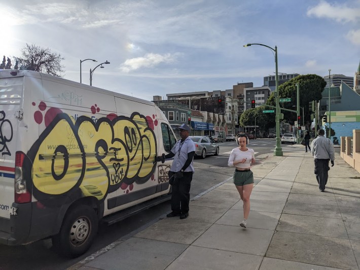 I have front and rear-facing safety cameras on my bike (the incident was caught by my tail camera). But I realized there was no way my cameras could have captured the driver’s face. The main Oakland post office was on my way home. So I diverted slightly from my intended route and took Webster Street, which parallels Broadway, and then hung out for a minute or two on the corner of Jackson and 12th. Sure enough, the same postal truck circled the block down Jackson a minute later, turned down 12th, and parked. That graffiti was pretty hard to miss. So I nonchalantly waited on the sidewalk until the driver got out of the truck so I could take a picture of him with my cell phone.