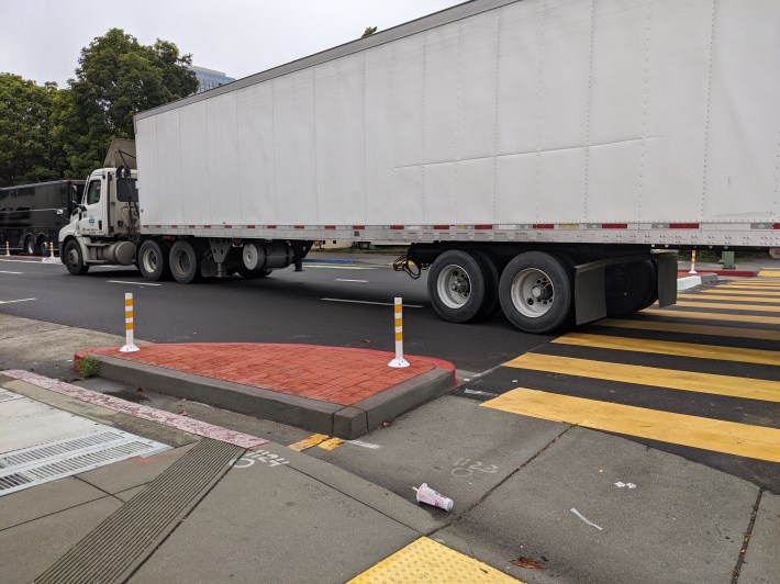 As if on cue, an 18-wheeler turned through the newly protected intersection of Jackson and 10th in Oakland's Chinatown neighborhood just as a press event celebrating its completion kicked off.