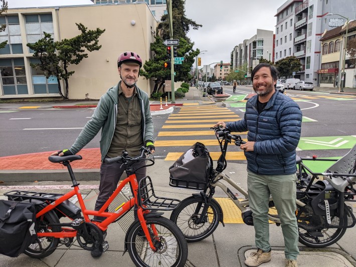 Prinz said he appreciated that the bike lanes were wide enough to accommodate cargo bikes and trailers. He also praised Oakland's Department of Transportation for prioritizing accommodations for disabled people, including two wheelchair ramps at each corner and an additional one mid-block.