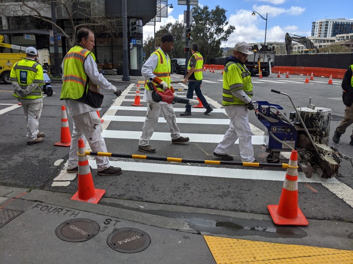 It also speaks volumes about city priorities that SFMTA doesn’t even close the intersection to drivers while crews are out repainting the crosswalks. Instead, the paint crews do their best to dodge and direct traffic as they work. Their safety should be prioritized and traffic stopped while they paint.
