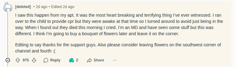 Several witnesses described the scene on a Reddit thread. “I heard someone screaming out ‘you’re dragging her’ and I looked in the intersection and saw the horrific scene,” wrote one poster.