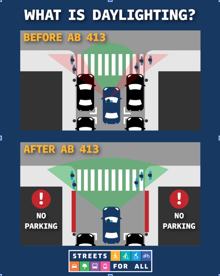The premise of AB 413 is not a magic fix, but it is a straightforward safety improvement for a deadly problem: visibility. By keeping the 20 feet of curb directly in front of a crosswalk clear of parked cars, it physically opens up the sightlines. It enables an approaching driver to actually see a pedestrian waiting to cross, rather than having that person completely hidden behind a wall of metal. With SUVs and trucks getting taller and wider every year, this visual buffer is basic, life-saving geometry. Given how simple and effective it is, it is no surprise that over 40 other states and many countries have had similar daylighting laws on the books for decades.