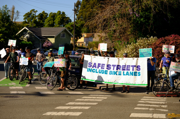 Berkeley advocates held a demonstration and march to city hall on Thursday evening to demand protected bike lanes on Hopkins. From a statement from the community organizers: