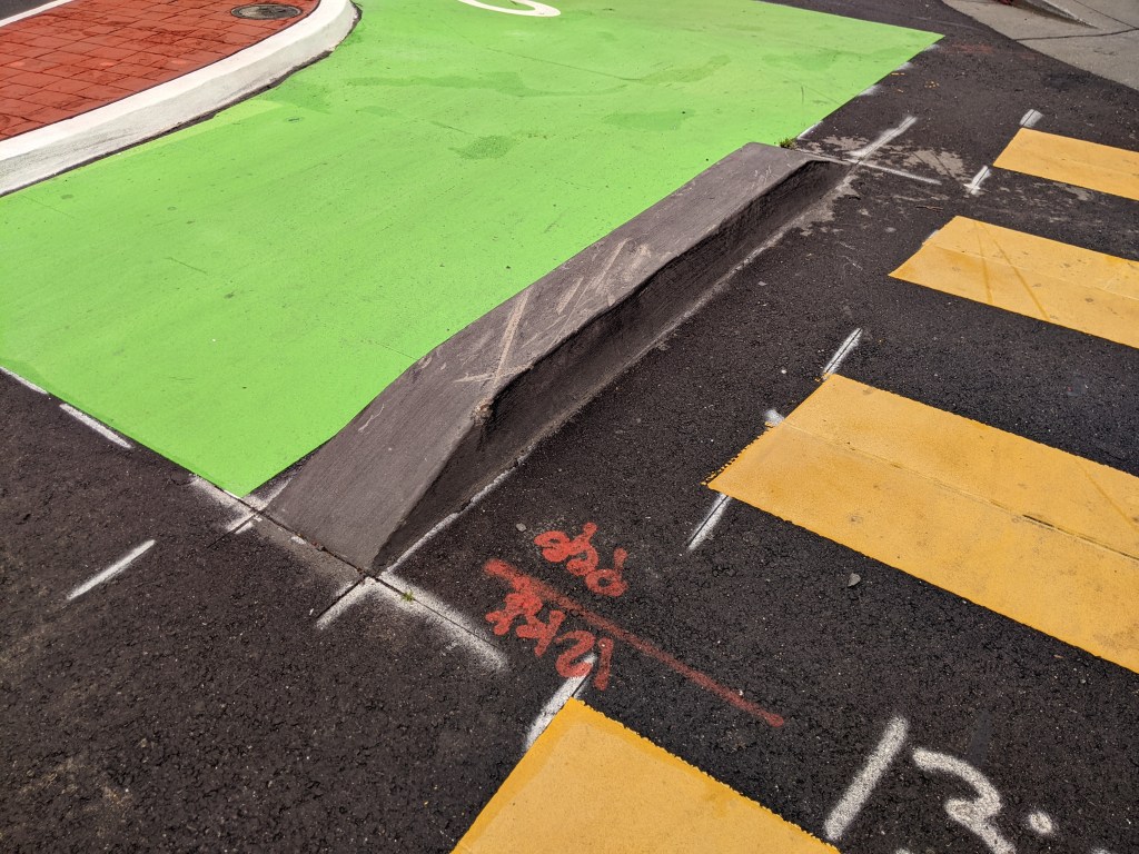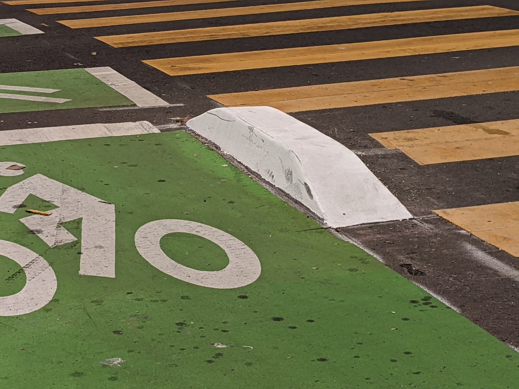 In February, Streetsblog attended a rainy ribbon-cutting of Chinatown Oakland’s first protected intersection, located at Jackson and 10th. This is the kind of safe intersection that needs to be installed all over. However, Streetsblog pointed out that the concrete blocks between the crosswalk and bike space, designed to keep drivers out, need to be painted. At night, especially after a rain (which darkens the concrete–see picture, above right), they’d be easy for a cyclist to crash into or a pedestrian to trip over. Note the scratches across the top.