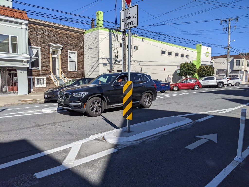 Streetsblog readers will recall that the neck-down, described as an “experimental” treatment to force drivers to look up from their cell phones and navigate the block at safe speeds, was installed last year. SFMTA collected data and found that it was working as intended: slowing traffic to a safe speed. It also did not cause any delays or collisions.
